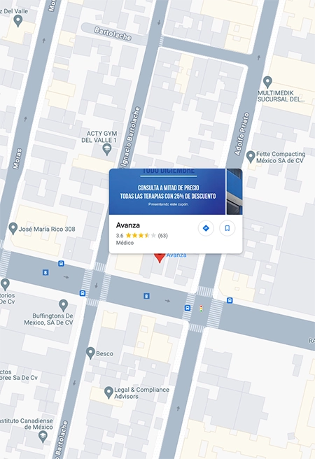 Sucursal Del Valle Inicio / Sucursales / Sucursal del Valle Exclusivo Atención a Pacientes 55 4358 7145 Para reporte de incidentes en sucursal. Dudas, Sugerencias o Hacer una Cita 55 5534 3520 55 5534 2036 55 5534 2994 delvalle@avanzarehab.com.mx José María Rico 326, Del Valle, 03100 CDMX.