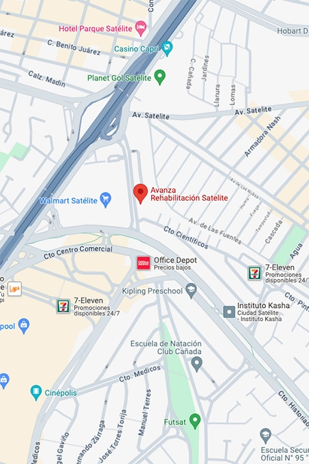 Sucursal Satélite Inicio / Sucursales / Sucursal Satélite Exclusivo Atención a Pacientes 55 4358 7145 Para reporte de incidentes en sucursal. Dudas, Sugerencias o Hacer una Cita 55 5393 9081 55 5393 9178 satelite@avanzarehab.com.mx Circunvalación Oriente 131, Cd. Satélite, 53100 Naucapan de Juaréz, Mex